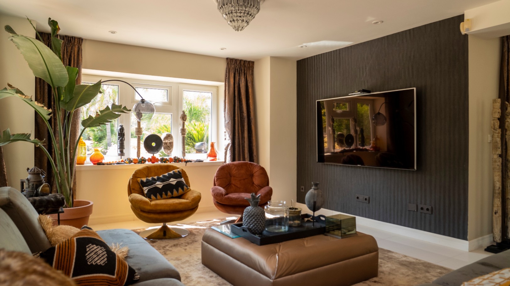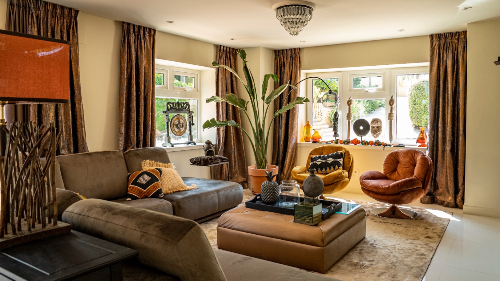 De woonkamer is royaal van formaat en voorzien van comfortabele banken en zorgvuldig gekozen designmeubels. Een centrale open haard voegt een gezellige en warme touch toe aan de kamer, waardoor het de perfecte plek is om te ontspannen en te genieten van het uitzicht op de tuin.