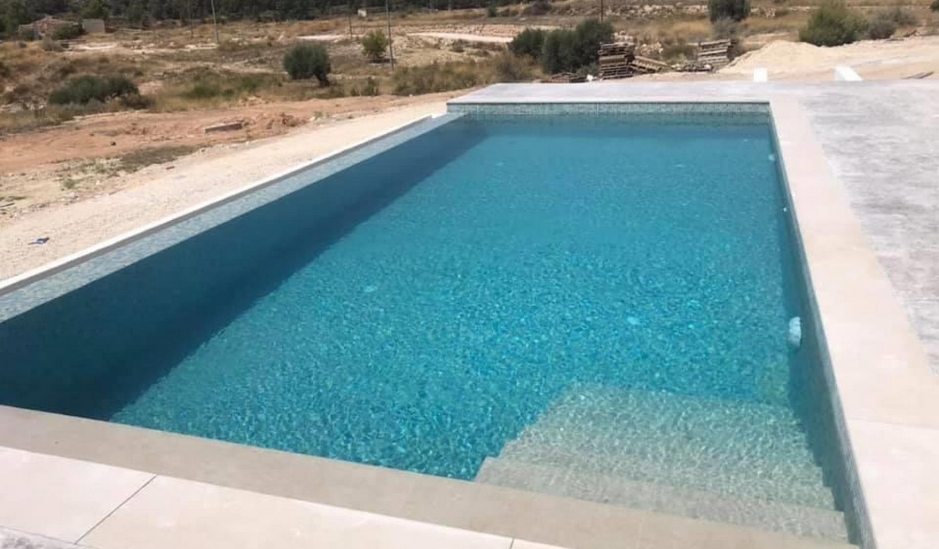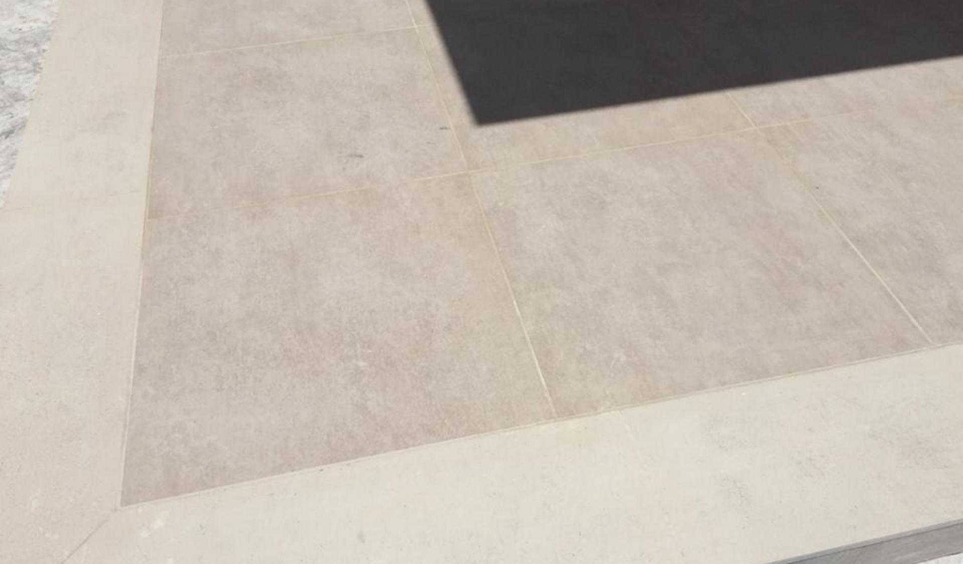 Privé zwembad van 4x8 meter met een zonneterras met sierbeton om het huis met het zwembad te verbinden.