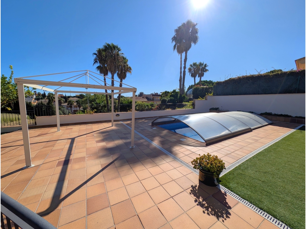 Op de begane grond bevindt zich een ruime en uitnodigende woonkamer van 31 m² met directe toegang tot een zonnig veranda-terras van 9 m², perfect om buiten te dineren of te ontspannen. Vanaf dit terras heeft u toegang tot het zwembad, voorzien van een uitschuifbare overkapping, dat in 2025 volledig gerenoveerd is. De zwembadpomp is in 2025 vervangen.