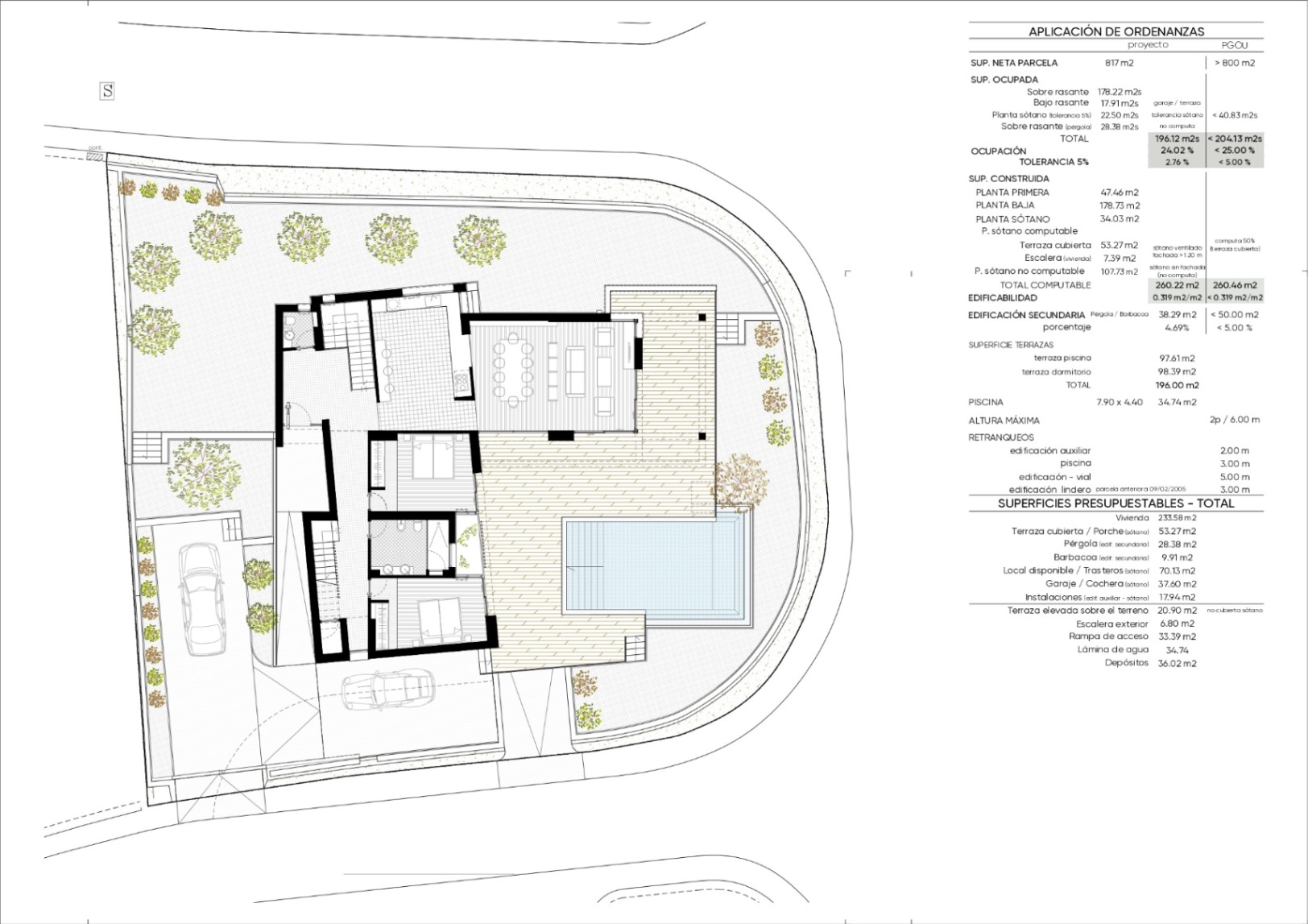 Begane grond: entreehal met trap, gastentoilet, een ruime woon- en eetkamer, moderne open keuken, twee slaapkamers en een badkamer. Vanuit de woonkamer heb je directe toegang tot het terras met een infinity pool en een pergola — perfect om te genieten van het mediterrane buitenleven.