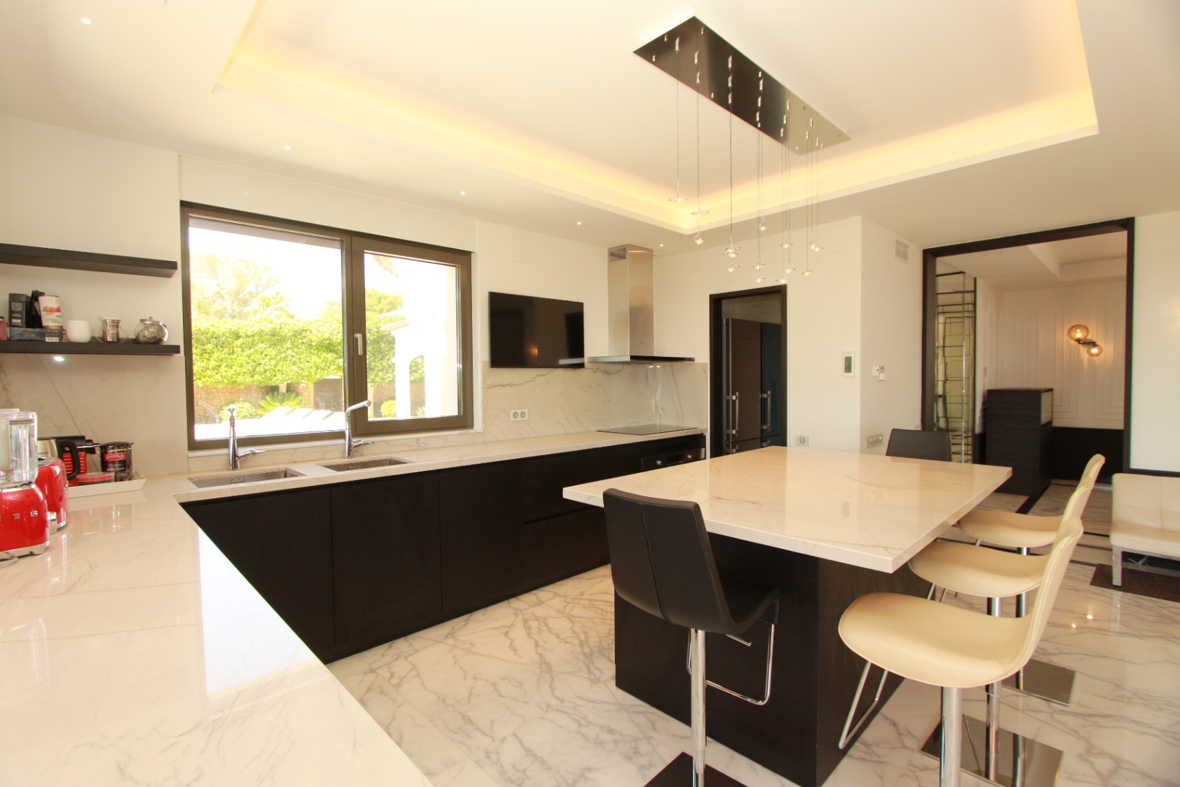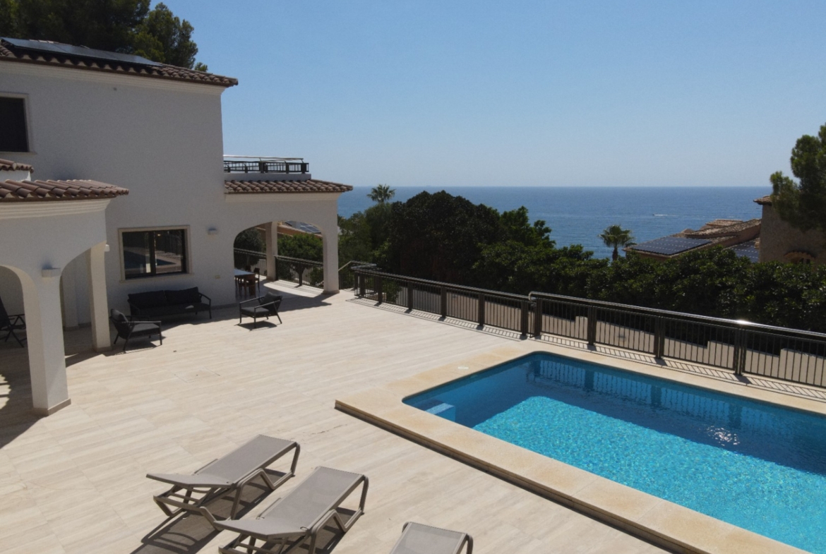 Luxe Mediterrane Villa op Tweede Lijn van de Zee in Moraira Aan de prestigieuze kust van Moraira, tussen de charmante stadjes Benissa en Moraira in de provincie Alicante, presenteren wij een echte vastgoedparel. Gelegen op de tweede lijn van de zee, geniet deze villa van een onovertroffen ligging: omringd door supermarkten, restaurants, cafés en op slechts 3 minuten rijden van het centrum van Moraira. Moraira, met zijn schilderachtige jachthaven, levendige sfeer, uitstekende gastronomie en vrijetijdsmogelijkheden, evenals zijn drie stranden en kristalheldere baaien, is de perfecte plek om het hele jaar door van de mediterrane levensstijl te genieten. De Woning Deze elegante villa heeft 456 m² bebouwde oppervlakte verdeeld over twee verdiepingen en ligt op een vlak perceel van 1.100 m². De toegang vanaf de straat is volledig vlak en leidt direct naar de tuin en de parkeerzone. Begane Grond Bij binnenkomst word je verwelkomd in een indrukwekkende hal die toegang biedt tot de verschillende ruimtes: • Rechts bevindt zich een lichte open woonkamer, eetkamer en keuken met een ruime voorraadkast. De keuken is volledig uitgerust en schuifdeuren leiden naar de overdekte veranda en het zwembad van 8 x 4 m. • Links van de hal bevinden zich een gastentoilet met garderobekast, een aparte wasruimte en twee ruime slaapkamers, elk met een eigen en-suite badkamer. Bovenverdieping Een elegante binnentrap leidt naar de bovenverdieping met twee indrukwekkende en lichte slaapkamers: • Eén slaapkamer is een suite met kleedkamer en een luxe badkamer met bad en douche. • De andere slaapkamer is ook ruim en beschikt over een eigen badkamer. Beide kamers hebben directe toegang tot een groot terras met uitzicht op de Middellandse Zee – een constante herinnering aan de unieke ligging van deze villa op slechts een steenworp van de zee. Voorzieningen & Buitenruimtes • Airconditioning via kanalen en splitsystemen (warm en koud) • Vloerverwarming • Zonnepanelen • Hoge plafonds • Hoogwaardige materialen en afwerking • Extra complete badkamer buiten • Zwembad van 8 x 4 meter • Diverse terrassen • Afgesloten garage voor 2 auto's • Grote technische ruimte • Buitenparkeerplaats voor meerdere voertuigen • Volledig gerenoveerd in 2021 • In perfecte staat Jouw Nieuwe Thuis aan de Costa Blanca Droom je van een moderne, ruime en lichte villa in mediterrane stijl met uitzicht op zee? Dan is dit jouw droomhuis. Neem contact met ons op – met meer dan 20 jaar ervaring helpen wij je graag. Jouw nieuwe thuis is slechts één klik verwijderd.
