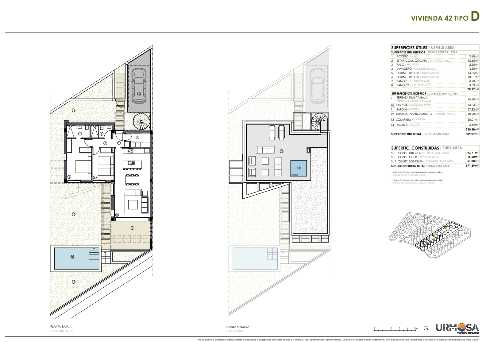 Beveiliging: Omheining, videointercom, automatische poorten. Verlichting: LEDverlichting in gemeenschappelijke ruimtes. Extra's: Infinity pool en jacuzzi (afhankelijk van de woning).