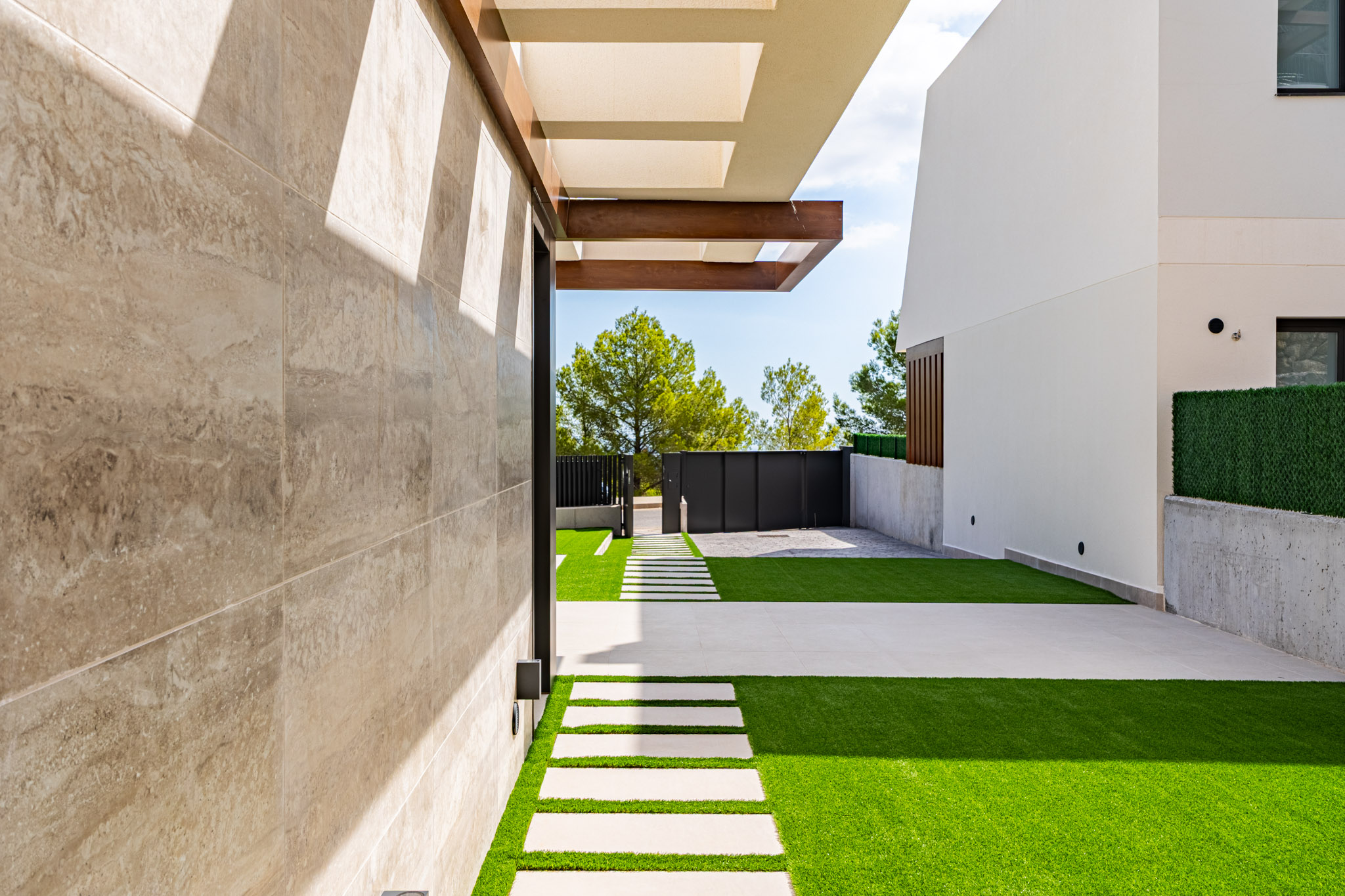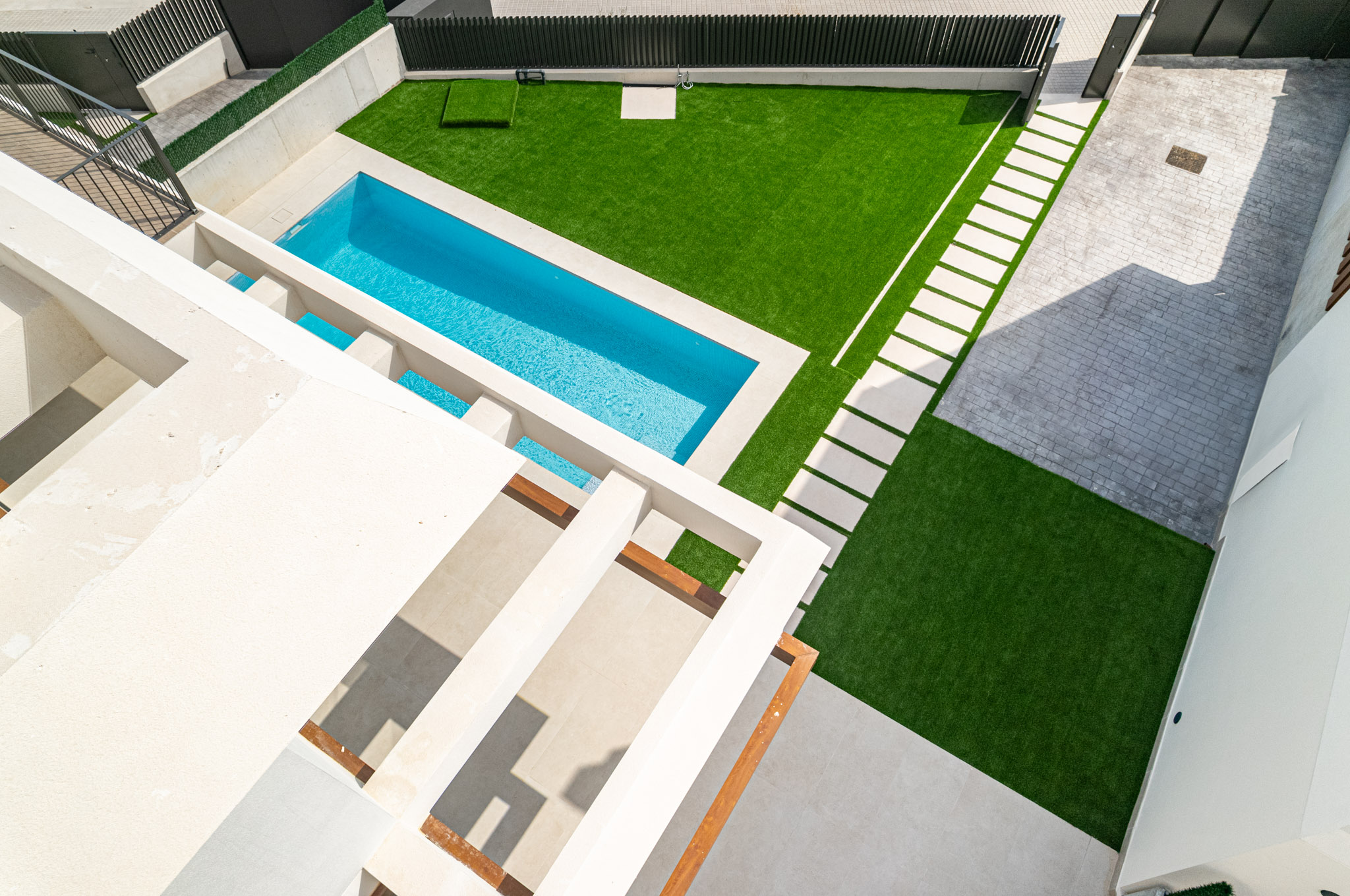 Structuur: Platen van gewapend beton met funderingen en trekbalken. Dak: Plat solarium met waterdichting, isolatie en buitenafwerking. Privéperceel: Omsloten met betonnen muren, metalen hekwerk, schuifpoort, parkeerplaats en tuin (kunstgras, grind, keramische bestrating).