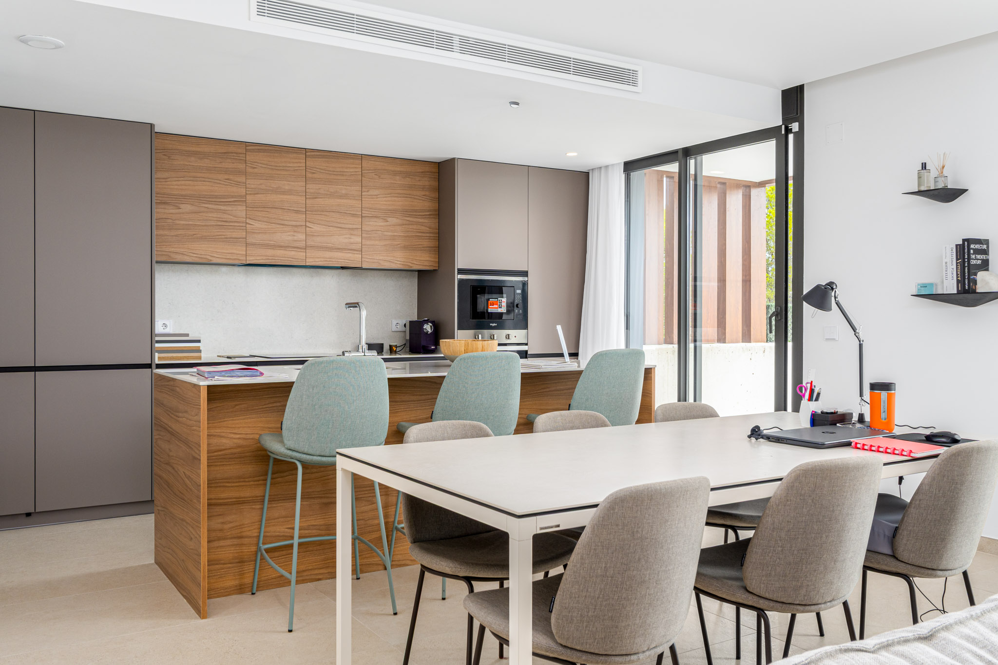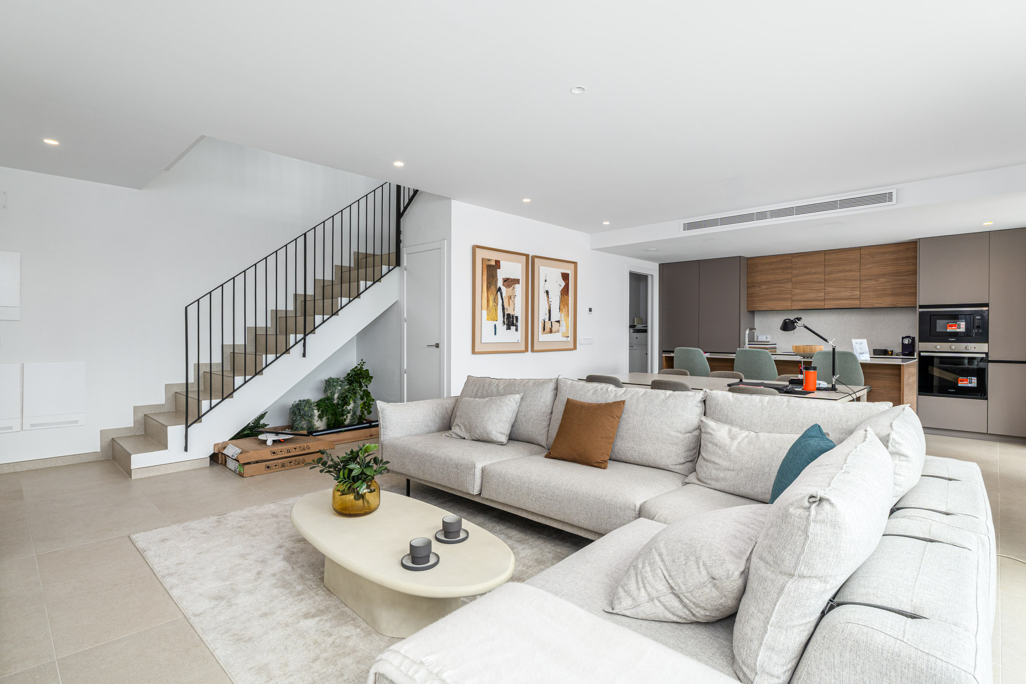 Stijl: Avantgardistisch ontwerp met eenvoudige lijnen en neutrale tinten, aanpasbaar aan uw smaak. Open keukens en kamers die zich openen naar buiten en opgaan in het landschap. Deuren: Gepantserde entree, gelakte binnendeuren, ingebouwde kasten. Badkamers: porseleinen sanitair, douchebak in hars, zwarte kranen, badmeubels. Keuken: Hoog/laag kasten, graniet/hars aanrechtblad, Whirlpoolapparaten (Siemensupgrade beschikbaar). Klimaatbeheersing: geleide airconditioning, aerothermisch warm water, optionele vloerverwarming.