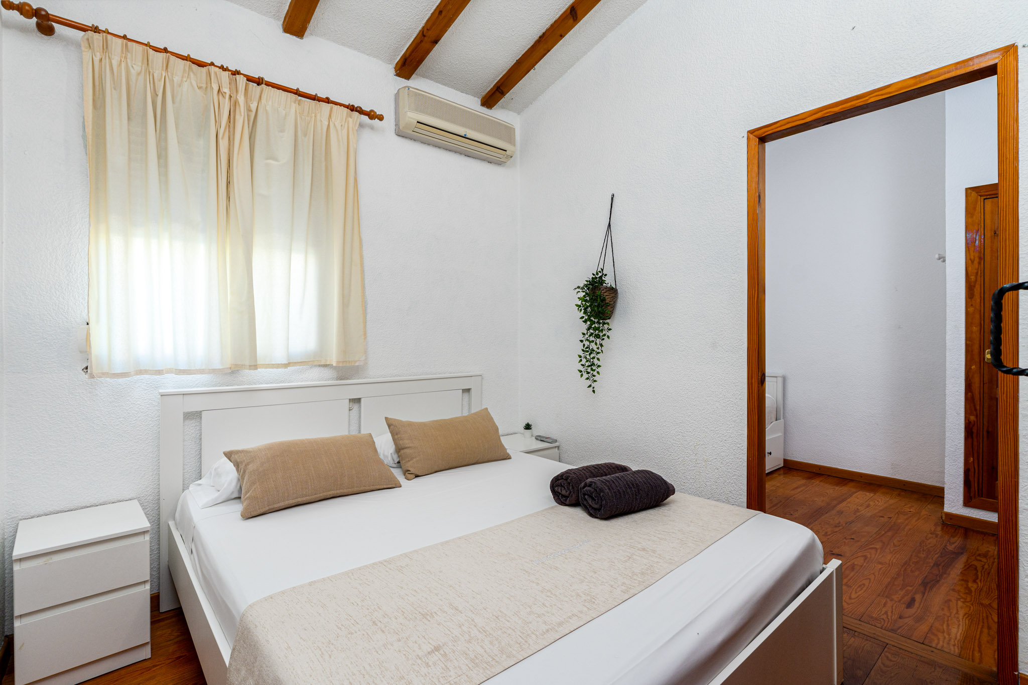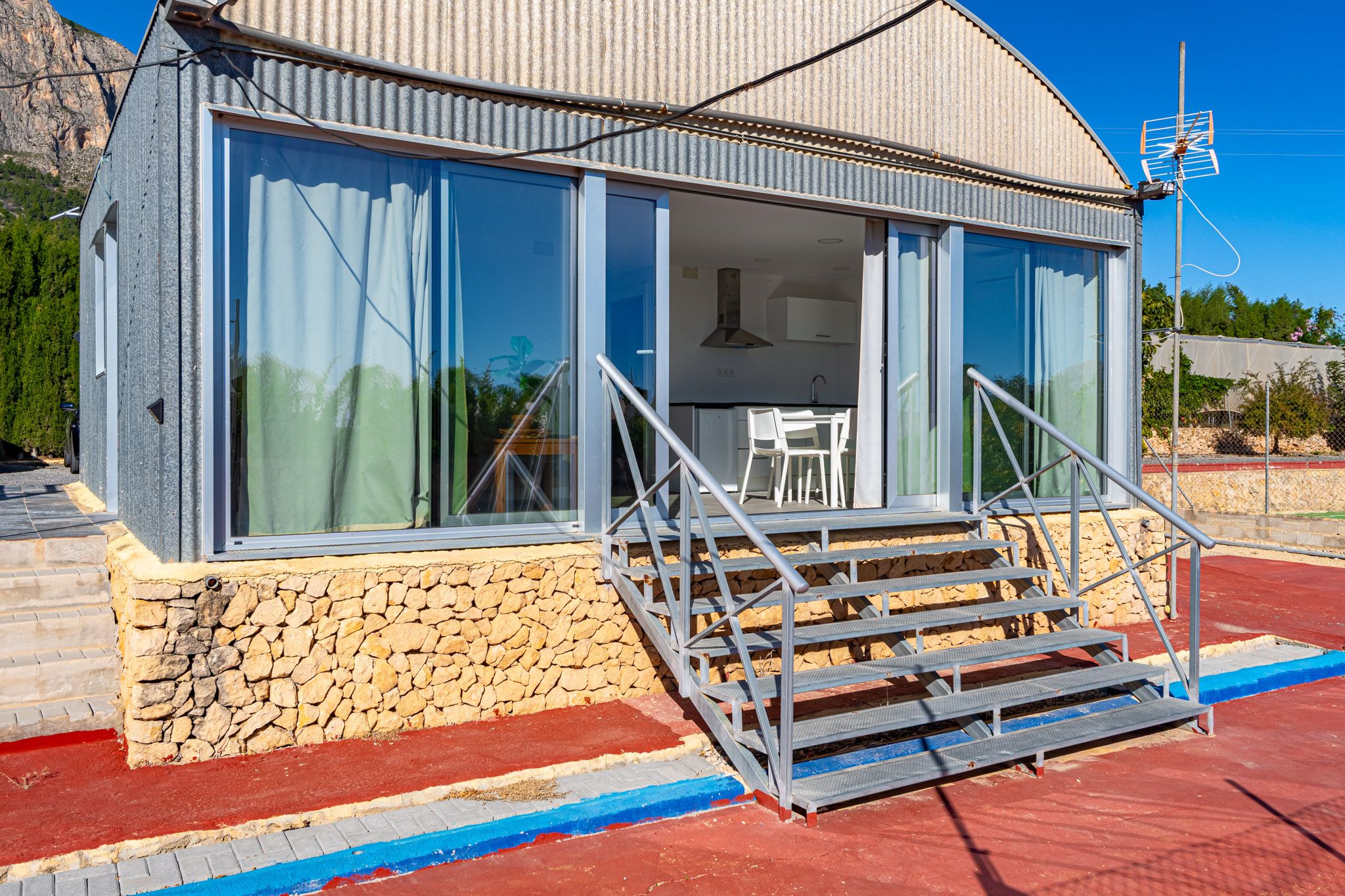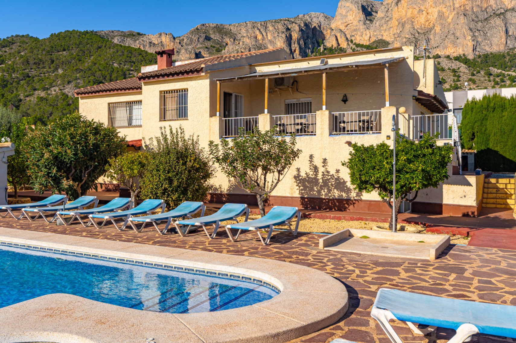 Het hoofdgebouw omvat vier ruime slaapkamers, een extra zoldergasten slaapkamer en drie complete badkamers. De woonruimtes zijn helder en uitnodigend, met grote ramen die een prachtig uitzicht op de bergen omlijsten. Het huis is uitgerust met individuele verwarming, airconditioning, een open haard en wordt volledig gemeubileerd verkocht. Verschillende terrassen, waaronder een overdekt terras en speciale chillout zones.