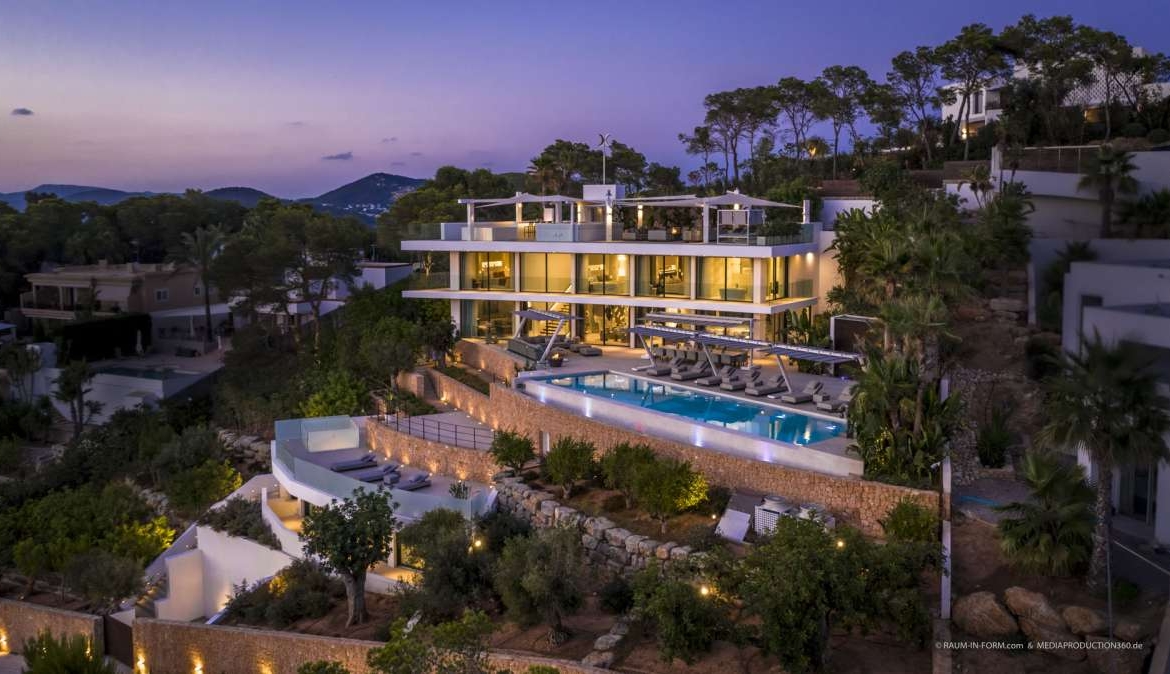 In het prestigieuze en beveiligde wooncomplex Roca Llisa, op een van de meest exclusieve locaties van Ibiza, ligt de elegante Villa Las Dos Lunas.