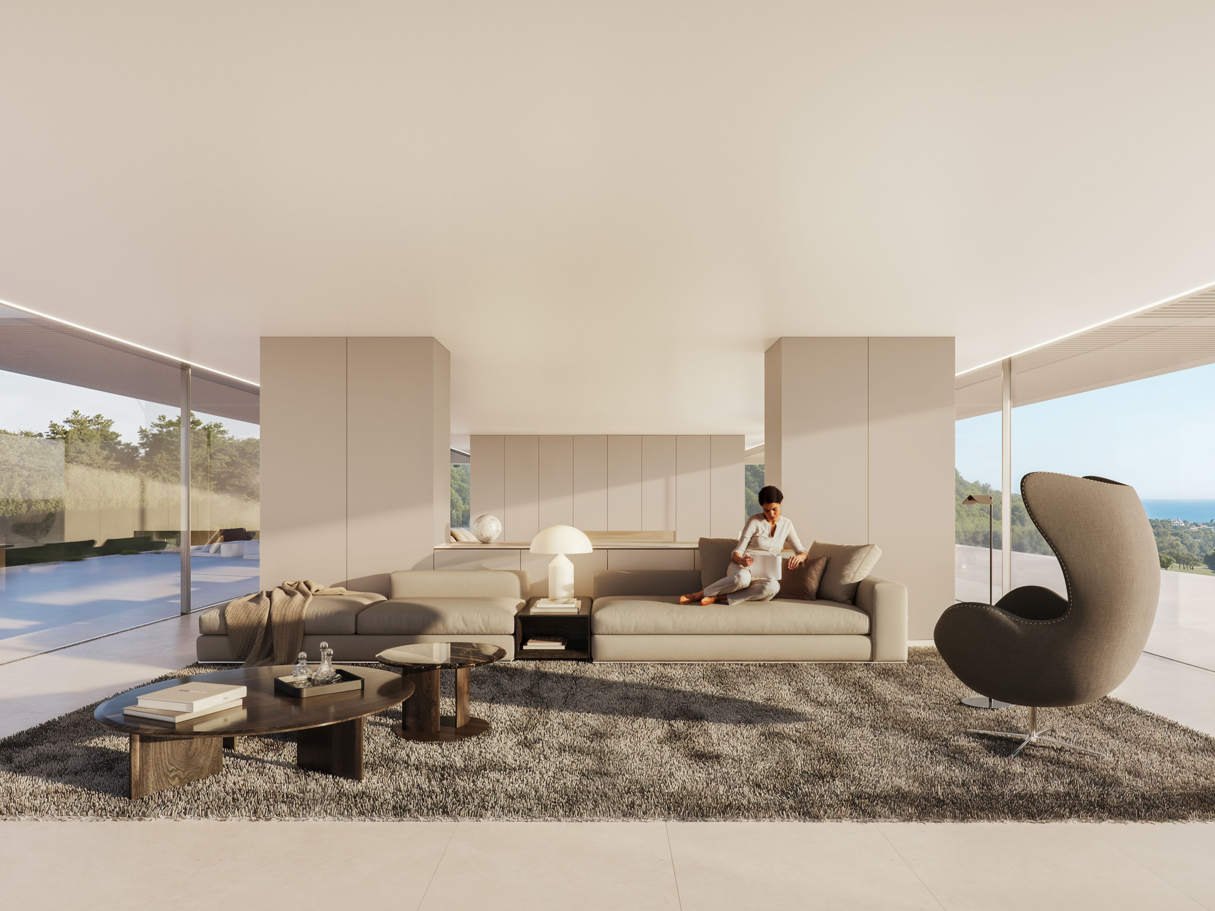 De villa heeft strakke lijnen en een trapsgewijs ontwerp dat ruime terrassen en een prachtig verwarmd overloopzwembad integreert, ideaal om het hele jaar door van te genieten. Er is ook een waterpartij en een garage voor vijf auto's. De buitenruimtes zijn ontworpen om te profiteren van natuurlijk licht en een uitzonderlijk uitzicht, waardoor een rustige omgeving ontstaat in het hart van de natuur, vlakbij stranden en exclusieve golfbanen.