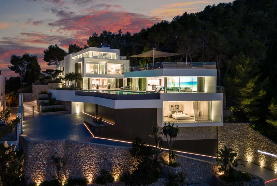 De omgevingIn Siesta, een rustig dorpje in Santa Eulalia, ligt deze ultra moderne villa. In slechts vijftien minuten rijden bevindt u zich in Marina Botafoc en in vijfentwintig minuten bent u al op de luchthaven van Ibiza. De schitterende stranden Cala Olivera, Cala Nova en Cala LLenya zijn te bereiken binnen enkele minuten rijden waar u in alle rust kunt genieten van witte stranden en helder blauwe zeeën. Het fijne aan Santa Eulalia is dat het veel minder toeristisch is dan bijvoorbeeld Ibiza Stad. Deze plaats kenmerkt zich door de lange boulevard wederom vol met genoeg leuke barretjes en eetgelegenheden. Er zijn hier aan de Oostkant van het eiland tevens nog veel authentieke restaurantjes en winkeltjes te vinden.De villaIn 2020 is deze ultramoderne villa door een bekende Duitse architect gerealiseerd. In totaal telt het zes luxe slaapkamers en zeven schitterende badkamers verdeeld over vier verdiepingen. Een van de kamers zou naar wens kunnen worden gebuikt als personeelsverblijf. De badkamers zijn ieder voorzien van een dubbele wastafel, bidet, bad en/of ruime douche. Voor alle badkamermeubels is gekozen voor de tijdloze kleur ‘wit Corian’ geïnspireerd op het Wenge-Design. Daarnaast faciliteert deze villa een uitgebreide fitnessruimte met vrijstaand ligbad en telt het nog 3 extra gastentoiletten. Alle kamers bevatten hoogwaardige LED-verlichting en het gehele huis is voorzien van airconditioning. De property is op ongeveer 750 m² gebouwd op een ruim perceel van 1500 m².Via de bekende Thyssen glazen lift met RVS kozijnen zijn de verschillende slaapkamers en verdiepingen gemakkelijk te bereiken. Op de begane grond is de grote, VIP-suite te vinden. Één verdieping hoger is de master suite gepositioneerd die een schitterend uitzicht geeft over de kraakheldere, Mediterrane zee. Tevens bevinden de drie gastenverblijven zich op de bovenste verdieping van de residentie. Alle gastenverblijven beschikken over een eigen badkamer en zelfs keuken. Voor het sanitair in deze property is gebruik gemaakt van slechts hoogwaardige kwaliteit van het bekende merk Grohe's Allure-Collection. Om extra luxe te creëren zijn er een voortreffelijke stoomdouches geplaatst in zowel de master- en VIP-badkamers. Tot slot zijn er in de suites evenzeer als badkamers een Ultra HD-flatscreen geplaatst. Naast de geweldig luxe slaapkamers is er een andere, werkelijke eye catcher: de enorme, open woonkeuken. Wederom hier is gekozen voor slechts de beste kwaliteit inbouw apparatuur. De magnifieke Miele keuken is uitgerust in de kleur hoogglans wit. De keuken beschikt over een ruim kookeiland, drie klimaatkasten en (ontbijt)bar met een stijlvol LED-verlicht, marmeren aanrecht. Sjouwen met flessen water hoeft hier niet, er is namelijk door het gehele huis een centrale osmosemachine die zorgt voor subliem drinkwater. Als klap op de vuurpijl is er in het verblijf een thuisbioscoop met een 85’’ 4K Ultra HD-TV. Het smart home-systeem wordt geleverd door Gira en uiteraard kunnen alle functies gemakkelijk via iPhone of iPad worden bestuurd. Het Sonos-muziekdistributiesysteem wordt standaard meegeleverd en zorgt voor een volledige bioscoop ervaring. Door het ‘Daikin’ airconditioningsysteem is het de hele zomer aangenaam koel in het huis, inclusief de garage. Voor de winterperiode is er door de gehele villa vloerverwarming.De buitenruimtesWanneer u zich naar buiten begeeft valt de infinity pool van 90 m² direct op. Ook in de avond is dit een werkelijk pronkstuk, het bassin is namelijk geheel verlicht met waterbestendig LED-verlichting. Aan het zwembad bevindt zich een voortreffelijke fitnessruimte, een bar, compleet uitgeruste badkamer en een barbecue waar verrukkelijke maaltijden kunnen worden bereid. Last but not least is er ook buiten de mogelijkheid om een bioscoop ervaring te creëren. Door een 4K ultra HD-projector aan de muur kunt u onder de sterrenhemel genieten van uw favoriete films. Rondom het zwembad zijn er heerlijke buitenmeubels geplaatst van het merk Missoni waar optimaal genoten kan worden in alle rust. De residentie heeft verschillende terrassen van in totaal 600 m² met een verbluffend uitzicht van 270° over de haven van Santa Eulalia en de diepblauwe zeeën die Ibiza te bieden heeft. Het paradepaardje van deze property is bij uitstek het schitterende dakterras met eigen jacuzzi en comfortabele lounge set welke kan worden overdekt door middel van een high-tec zonnewering systeem die wederom bediend kan worden met een Iphone of Ipad. Er is een grote, overdekte garage waar met gemak vier auto’s kunnen worden gestald. Tot slot is er een zogeheten ‘State-of-the-art’ alarmsysteem met GSM-aansluiting en brandalarm, 13 bewakingscamera's van Mobotix en binnenin een Ritto-Intercommunicatiesysteem. Het moge duidelijk zijn dat bij deze zeer luxe en moderne residentie, het niks te wensen over laat.